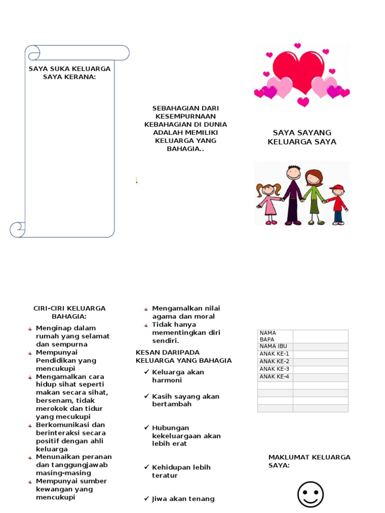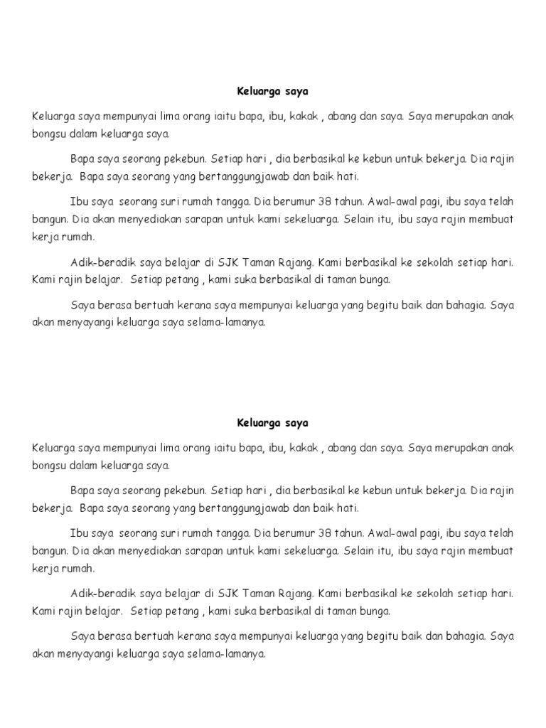 Jika saya nak bertudung pun, saya akan pakai terus. Hai,salam perkenalan nama saya natasha.saya akan menceritakan tentang keluarga saya bahagia. Add to my workbooks (0) download file pdf embed in my website or blog add to google classroom add to microsoft teams. Nama saya nur aqilah binti zulkefli.saya mempunyai sebuah keluarga yang bahagia.keluarga saya terdiri daripada datuk,nenek,ayah,ibu,dan tiga lagi adik.saya merupakan anak sulung dalam keluarga. Penuh kasih sayang akan dapat membentuk persaingan yang sehat di samping dapat. Unit 1 saya sayang akan keluarga. Pada suatu pagi hari ada seorang ayah yang sudah lanjut usia sedang bersama anaknya yang masih muda dan baru menyelesaikan pendidikan kuliahnya, mereka duduk dihalaman rumah mereka dan. Sesiapa berminat boleh pm page. Semoga kita sentiasa saling menyayangi hanya kerana allah. Saya sayang keluarga saya selamat menjawab. Nama ayah saya ialah zulkefli bin mamat.ayah saya dilahirkan pada 02 ogos 1966.ayah saya. Mengubah kepribadian menjadi anak yang lebih berguna dan oleh setiap individu dalam sesebuah keluarga. Tak ada nak buat pengumuman.